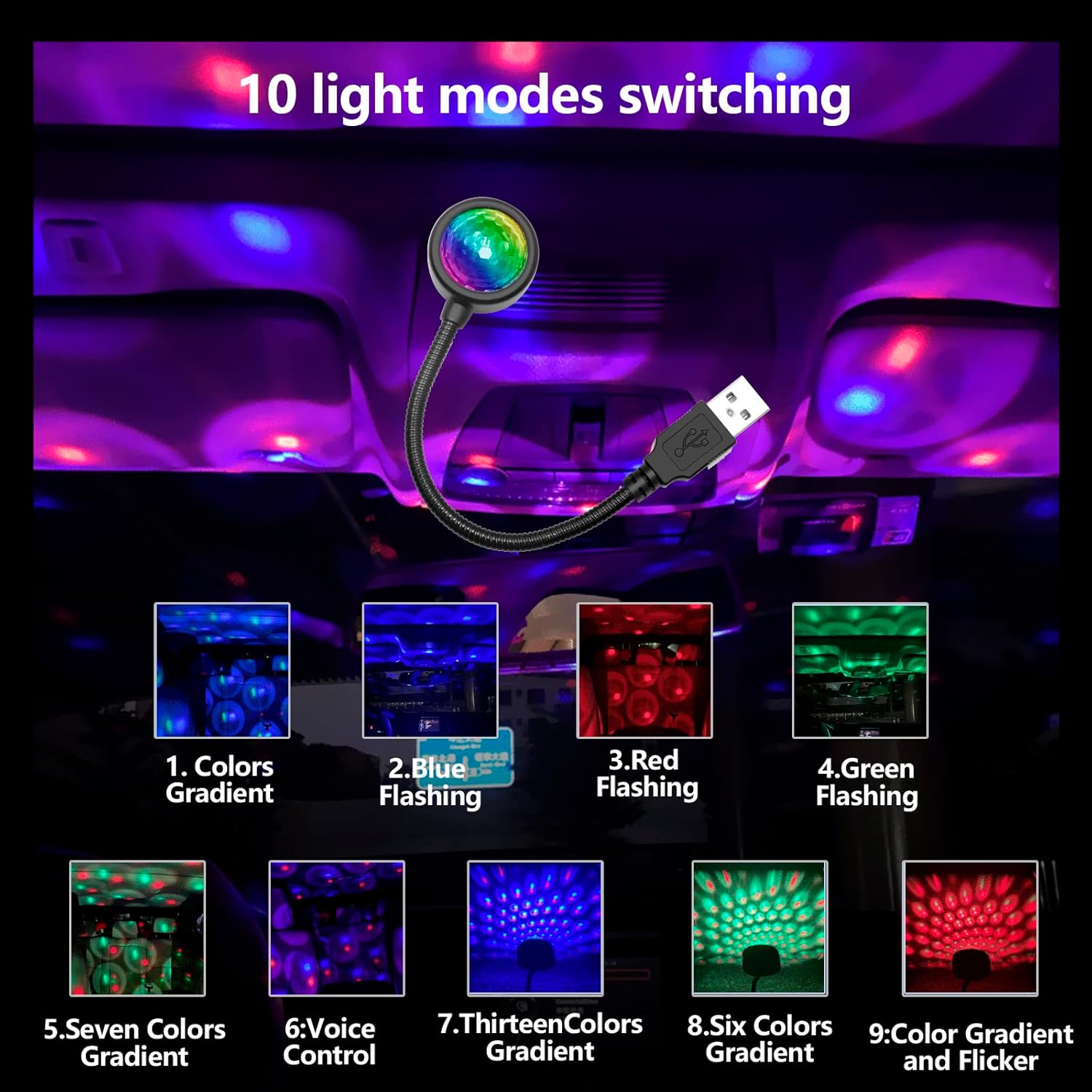 USB ვარსკვლავური ღამის შუქი, მუსიკასთან სინქრონიზაცია, რეგულირებადი ავტომობილის სახურავის შუქი 9 ფუნქციის რეჟიმით და 4 ფერით, 5V პორტატული შიდა LED შუქები მანქანის დეკორის, ჭერის, საძინებლისა და წვეულებისთვის. (RGB)
